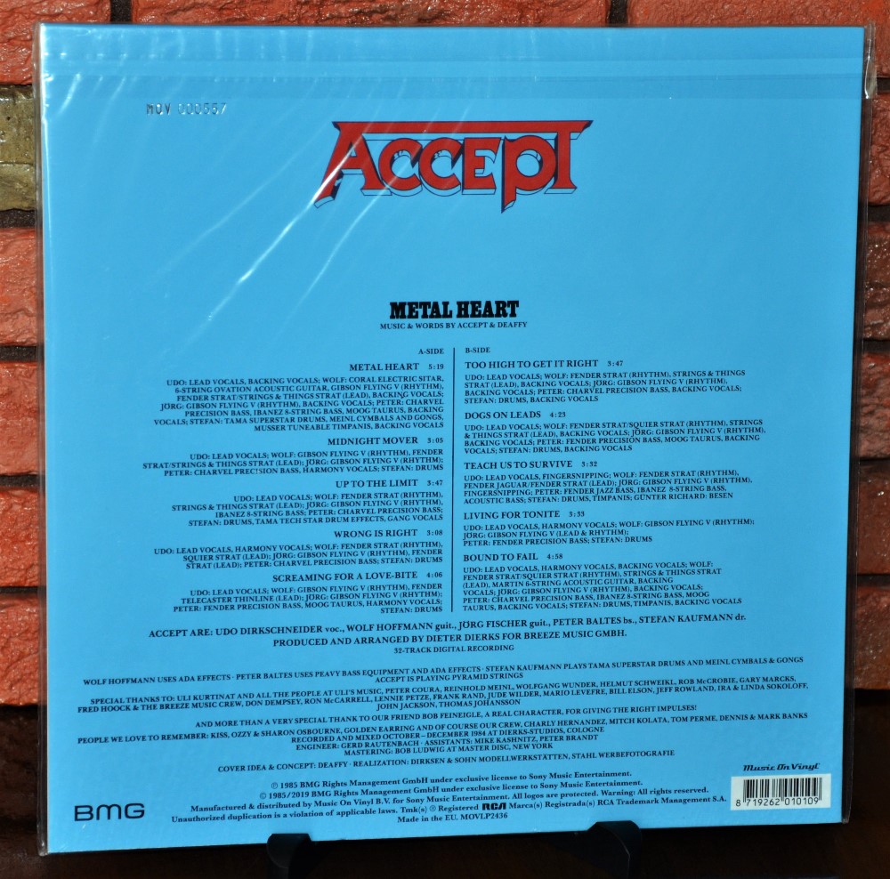 With "Metal Heart", Accept attempted to add catchier choruses and melodies to their high-octane guitar riffing in a clear ploy to crack the American market. Not that this move in any way upset the balance of their thus-far smooth-running Metal machine, which had been gaining momentum with every release since the start of the decade. "Metal Heart" was certainly a step toward accessibility, but a cautious one at that. You gotta hand it to Accept, they sure knew how to make an entrance by now, and the apocalyptic title track is about as dramatic as it gets, with guitarist Wolf Hoffman taking the helm on a long, mid-song solo excursion containing equal nods to Beethoven and Edward Van Halen. First single "Midnight Mover" is next, and along with the even more melodic "Screaming for a Love-Bite", it places obvious emphasis on hooks and melodies (and proved to be the toughest to stomach for the band's more hardcore fans). But despite another strange detour into Jazz territory with the bizarre "Teach Us to Survive," Accept still packed amazing power, heaping on their Teutonic background vocals for the ultraheavy "Dogs on Leads" and gleefully pile-driving their way through relentless moshers like "Up to the Limit" and "Wrong Is Right". The brilliantly over-the-top "Too High to Get It Right" finds Dirkschneider screeching like never before, and to cap things off, the band really cooks on "Living for Tonight" - arguably the best track all around. A winning set!