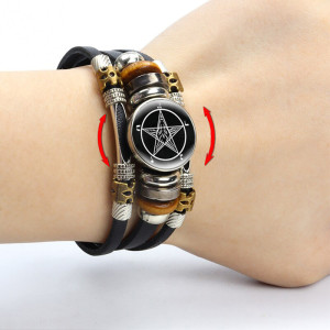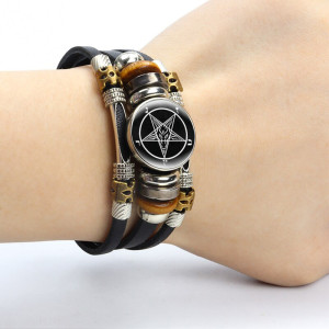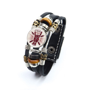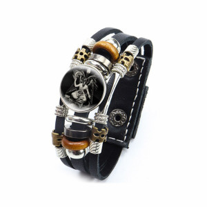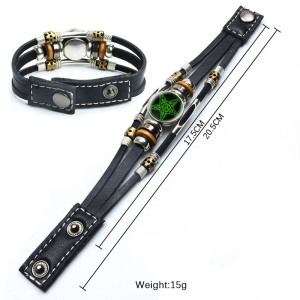 Black leather bracelet with Trident pattern rotatable glass cabochon. Choose cabochon type: A, B, C, D… etc. Gender: unisex Material: leather, glass Metal Type: alloy Glass Base diameter: 18 mm Bracelet length: 17,5 / 20 cm (adjustable)..