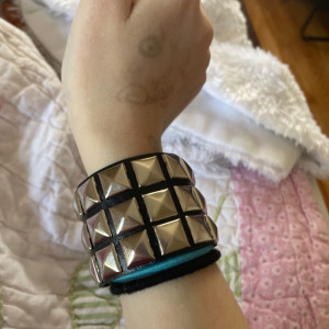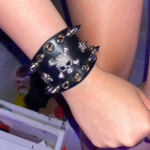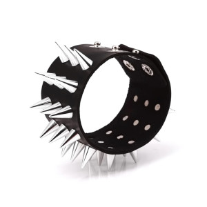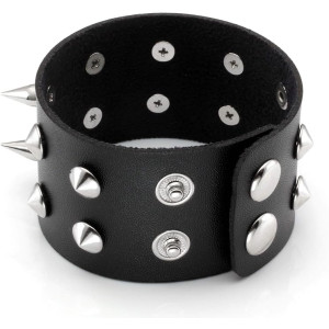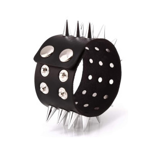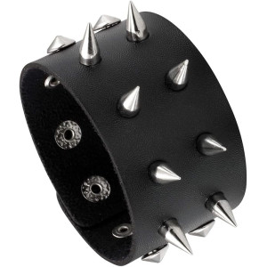Wide cuff leather Metal/Punk/Gothic Bangle with Spike Rivets. Length: 22,2 cm Width: 4.9 cm Setting type: tension setting Material: PU leather, zinc alloy Clasp type: hidden-safety-clasp Gender: unisex Colour: black..