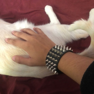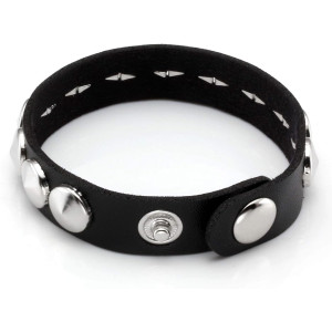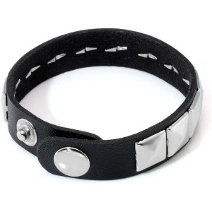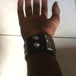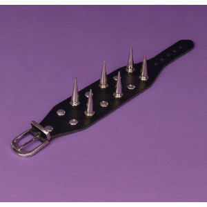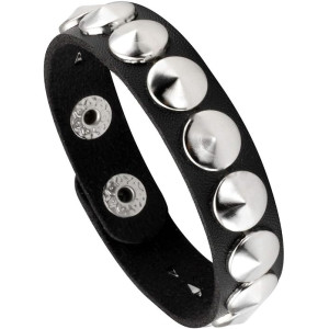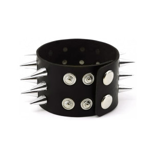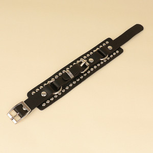 Leather Metal/Punk/Gothic bangle with spike rivets and buckle. Length: 21 cm Width: 3,8 cm Setting type: tension setting Material: PU leather, zinc alloy Clasp type: buckle Gender: unisex Colour: black..