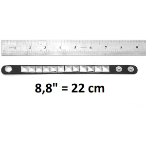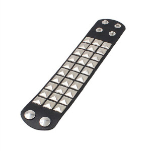 Leather Metal/Punk bangle with pyramid rivets. Length: 22 cm Width: 4,4 cm Setting type: tension setting Material: PU leather, zinc alloy Clasp type: hidden-safety-clasp Gender: unisex Colour: black..