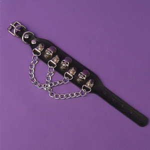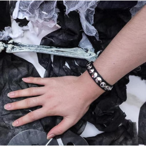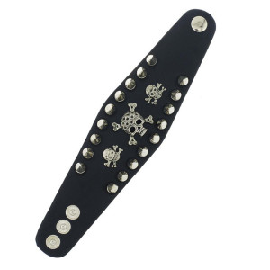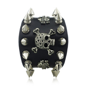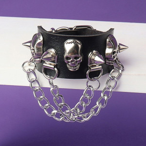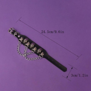 Leather Metal/Punk/Gothic/Bike bangle with spikes, skulls, and chains. Length: 22,5 cm Width: 3,1 cm Setting type: tension setting Material: PU leather, zinc alloy Clasp type: buckle Gender: unisex Colour: black..
