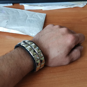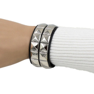Leather Metal/Punk bangle with pyramid rivets. Length: 22 cm Width: 3 cm Setting type: tension setting Material: PU leather, zinc alloy Clasp type: hidden-safety-clasp Gender: unisex Colour: black..