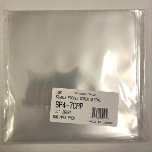 The 7'' sleeves for EPs made from 100% transparent 40-micron polypropylene film. Sleeves have sufficient strength to save from water, damage, dust, mud or fingerprints. SP4-7CPP. Made in Canada...